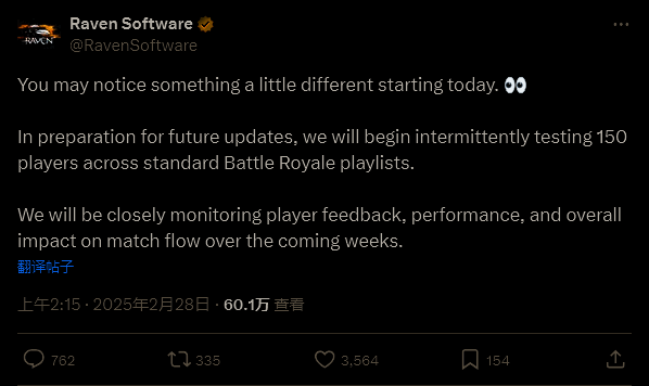 Raven 透露,并非每一场比赛都会有 150 人,目前只是“间歇性”测试,工作室将在“未来几周密切关注玩家的反馈、表现以及对比赛流程的整体影响”。测试不会在排位模式中进行。