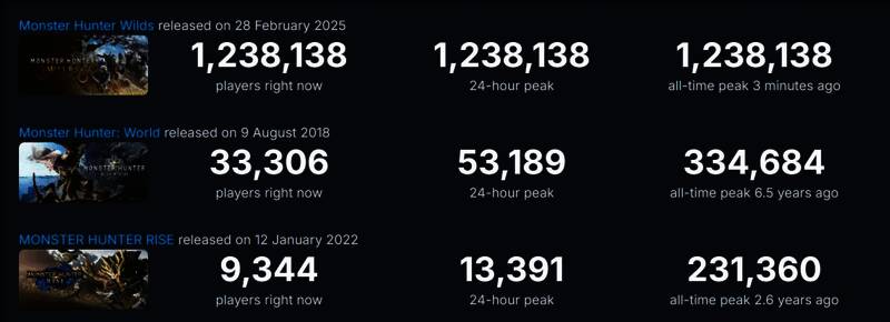 《怪物猎人:荒野》首发Steam同时在线峰值超过了100万,目前为114万4849人,已是Steam上第8个同时在线超过百万的游戏,同时也是Capcom首个Steam峰值破百万的游戏。