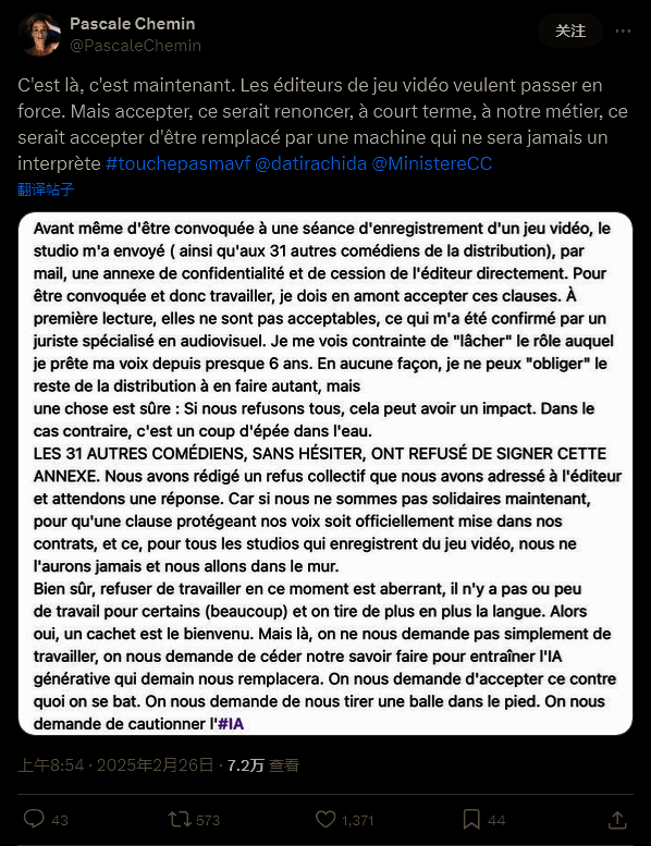 而她的同事显然选择了站在她这一边,Chemin继续写道:“其他 31 名配音演员毫不犹豫地拒绝了签署这份协议。我们写了一封集体拒绝信,发给了发行商,正在等待回复。如果我们现在不团结起来,将保护我们声音地条款正式添加到我们的合同中——不只是我们,而是每个电子游戏配音工作室——我们将永远得不到一个(公正的协议),我们将走向灾难。”