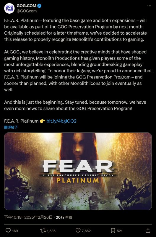 《极度恐慌》初代的白金版本,包括游戏本体以及两个 DLC 是这次被纳入“GOG游戏保护计划”的内容。在社交媒体,GOG发布声明写道:“MonolithProductions 为玩家带来了一些最难忘的体验,将开创性的游戏玩法与丰富的故事情节融为一体。为了保留他们的遗产,我们很自豪地宣布,《极度恐慌:白金版》将加入 GOG 保护计划。”游戏目前以 1 美元的价格在 GOG 销售,该平台任何游戏都不包含 D 加密。