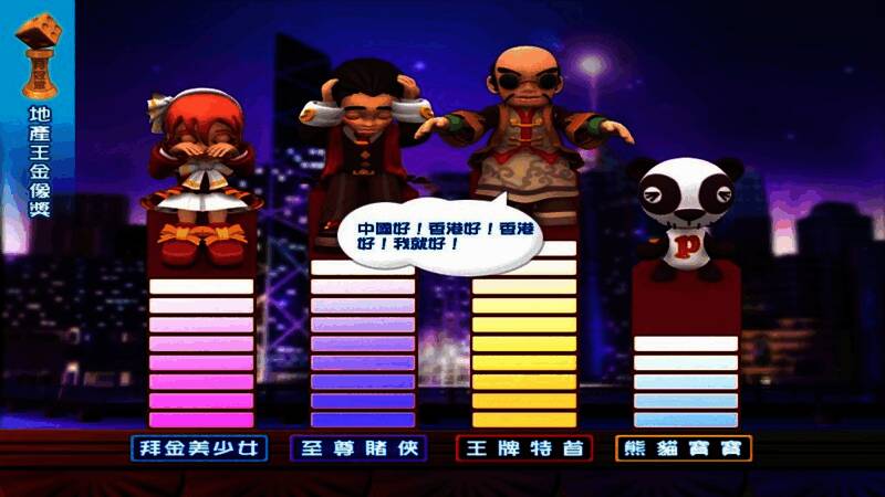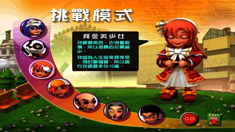 爱耍宝的机器人、千里寻母的熊猫宝宝、崇拜名牌的拜金美少女、来自神秘星球的金鸡女超人、众人景仰的王牌特首、富可敌国的香江地王、还有喜爱劫富济贫的至尊赌侠。他们不只造型逗趣,还有不同的能力,一定机率免缴过路费的赌侠、买地成本减半的地王、不同的人物就有不同的玩法、给你不同的乐趣!