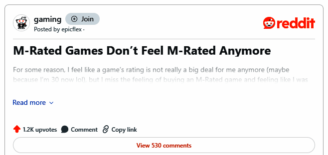 游戏等创作物都会被评级,目的很明确,保护未成年儿童,现在问题来了,日前有老外玩家发帖表示游戏有流血场面就被ESRB评级为M(17岁以上),实在过于严苛,现在儿童的抵抗力或许已经超出了你的想象。
