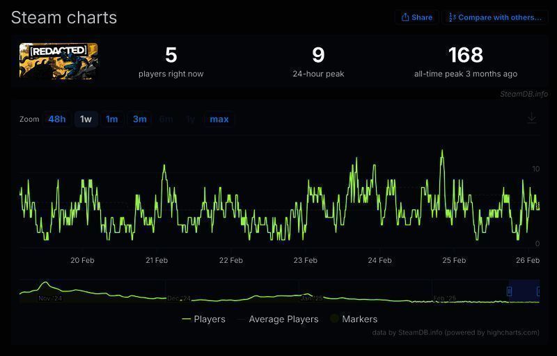 工作室目前已发布了第二款小体量俯视角肉鸽射击游戏《[REDACTED]》,获得了不错的评价,然而游戏依然没有多少受众,后台显示游戏的最高玩家峰值仅为 169 人。
