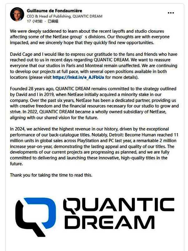 在最近的领英帖子中,量子梦工作室的首席执行官和发行主管Guillaume de Fondaumière谈到了他们目前的状况,他对网易旗下某些工作室关闭和裁员深感悲痛,但量子梦工作室旗下的两个分支机构:巴黎办事处和蒙特利尔办事处,都不会受到任何不利影响,他们的项目正在全速推进中,甚至最近还在招聘新员工。