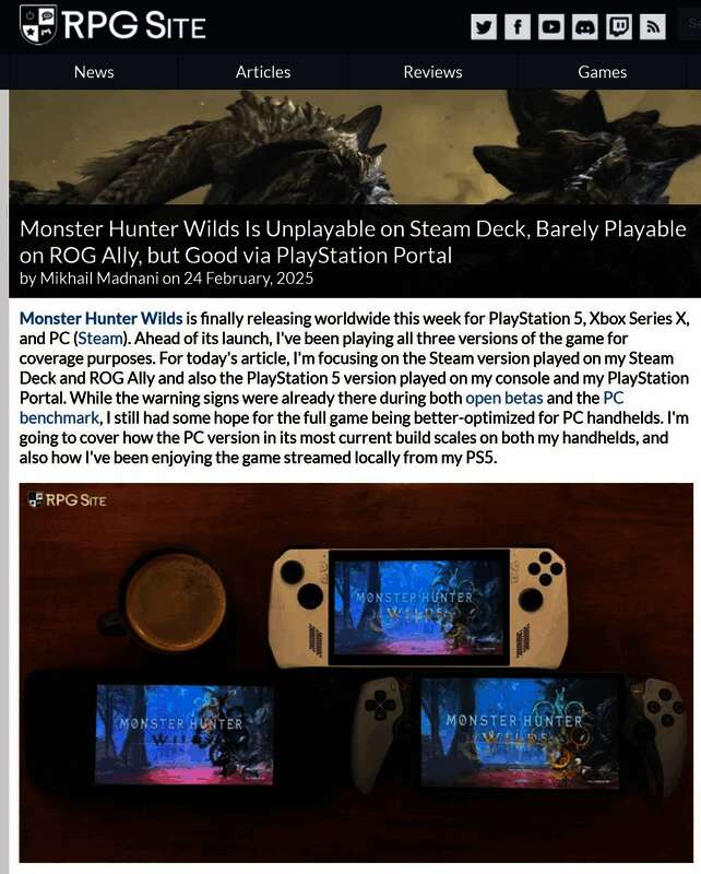 据外媒RPG Site报道,根据记者亲测,Capcom的这款3A狩猎游戏在Steam Deck上无法游玩,在华硕掌机ROG Ally上勉强能玩,不过PlayStation Portal则一点问题没有,玩的很流畅。