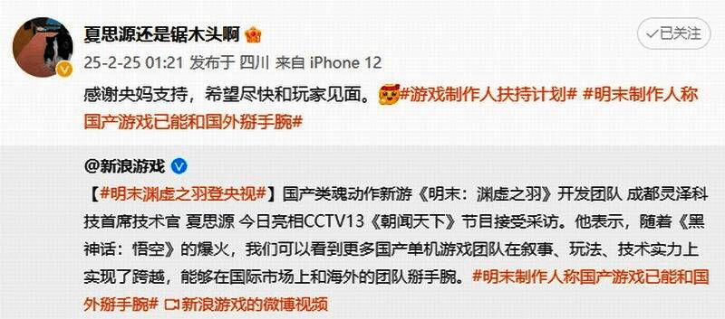 近日央视《朝闻天下》播出了对《明末:渊虚之羽》制作团队的采访。制作人夏思源在微博上发文,感谢央视的支持与报道,希望游戏能尽快与玩家见面。