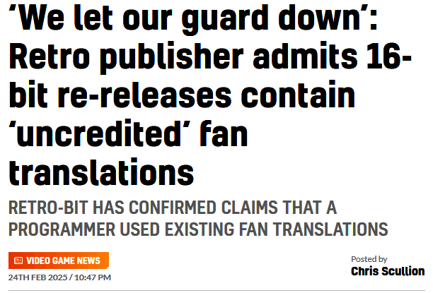 一家专门生产怀旧游戏、替换游戏机以及手柄外设的周边厂Retro-Bit被网友揭发,没有获得许可擅自剽窃玩家的本地化翻译,日前官方承认问题并暂停了游戏发布。