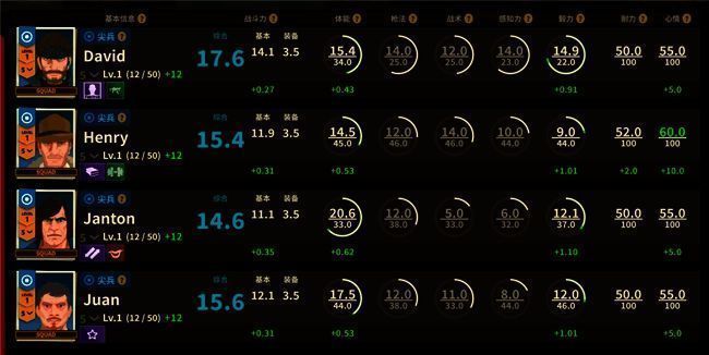 游戏中玩家的小队最多可以编入4名职员,他们不仅有不同职业,还有不同的天赋与能力值,你可以在猎人那里根据自己的需求招募员工。比如你有了个非常抗揍几十子弹都打不死的前排先锋兵,那后排的狙击手只要枪法够准,那身体再虚弱也不碍事。