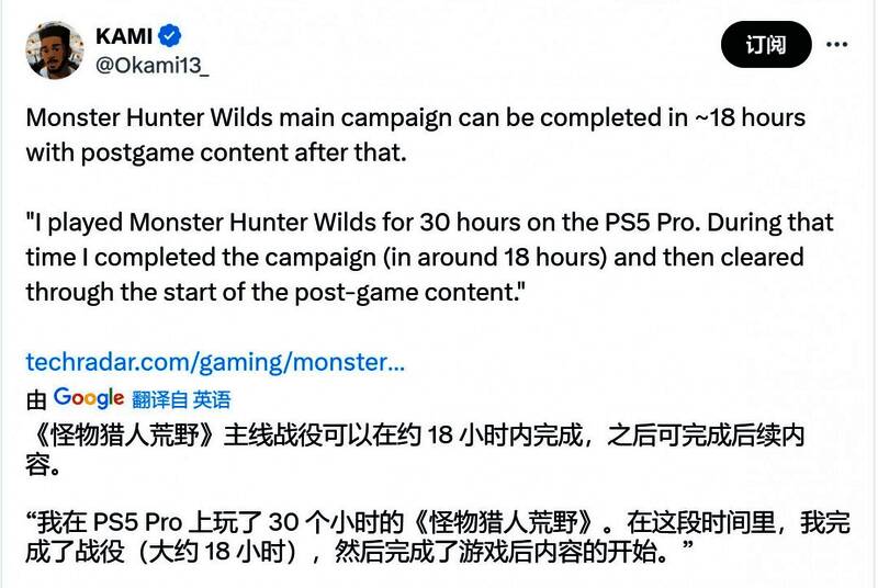 根据外媒的评测,《怪物猎人:荒野》主线任务18小时左右