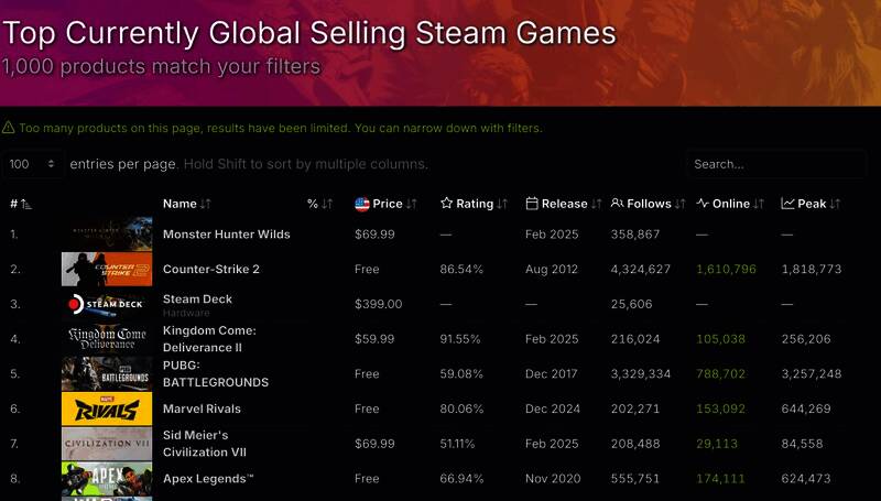 根据SteamDB统计,《怪物猎人:荒野》已是Steam全球最畅销的游戏(按收入),而这款游戏还没有正式发售,仅仅通过预购就已经取得了第一名。