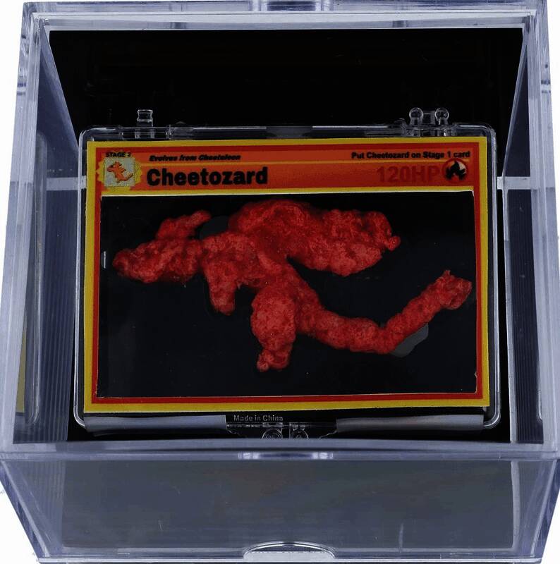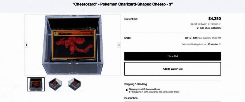 这个奇多薯片被命名为“Cheetozard”,放在一个类似宝可梦卡牌的定制框架中展示。由于竞拍截止时间为3月2日,所以价格仍有上升空间。
