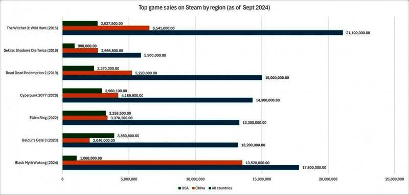 近期网友分享了一张统计多个3A游戏(PC Steam版)在中国和美国销量的图表,统计数据截止2024年9月,凸显中国作为Steam上3A大作最重要的市场之一。