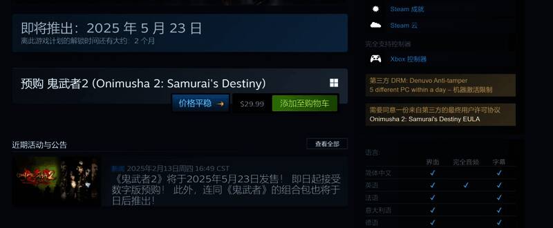 《鬼武者2:复刻版》Steam页面更新,游戏的PC配置要求公开,同时确认采用D加密系统。