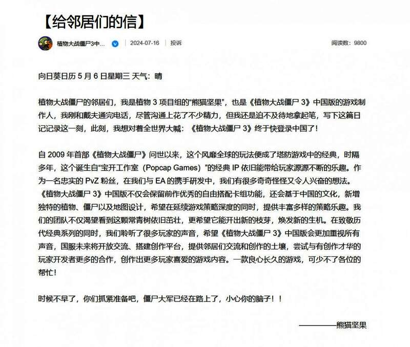 此外,他还表示《植物大战僵尸3》中国版会更加重视所有声音,国服未来将开放交流、搭建创作平台,提供邻居们交流和创作的土壤,尝试与有创作才华的玩家开发者更多的合作,创作出更多玩家喜爱的游戏内容。