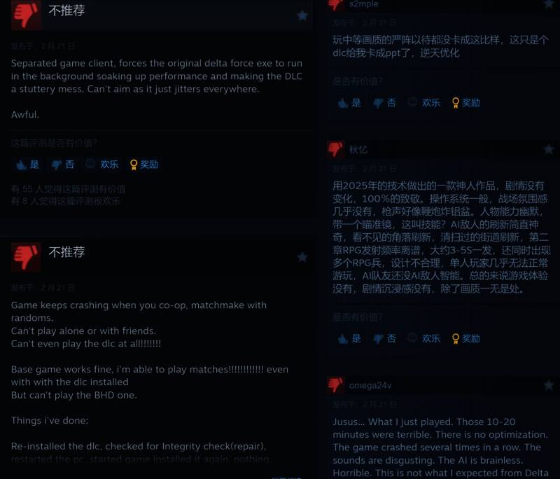 《三角洲行动》单人战役“黑鹰坠落”现已在Steam上免费上线,截至目前该单人战役在Steam上获得403个评价,好评179条,差评224条,好评率44%,为褒贬不一。不过中文区的评价有点惨,在109个中文评价中,好评率仅29%,为“多半差评”。