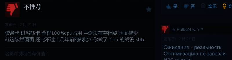 有中文网友反应,读条卡,进游戏卡,全程100%的占用,中途没有存档点,画面拖影。