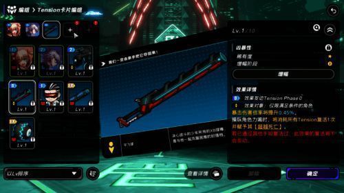 这套Tension系统类似于角色能量值。一方面,攻击性强大的角色终结技需要消耗己方的Tension能量;而在另一方面,游戏还加入了“Tension卡片”机制,玩家的每个编队都可以选择五个卡片进行搭配,其中每个Tension卡片都需要消耗相对应的Tension能量值,从而为角色提供战斗数值加成和各种各样的技能效果,帮助玩家更快地解决战斗。