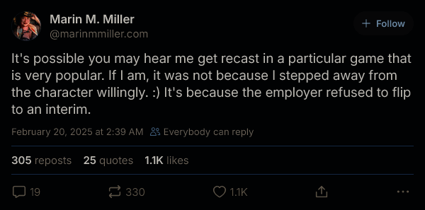Miller 在社交媒体上发帖称,由于该工作室决定不签署美国演员工会-电视和广播艺人联合会(SAF-AFTRA)的新临时协议,隶属于该工会的配音演员负责的角色可能会被工作室“重新选角”。在后续的帖子里这位演员表示,如果他们的粉丝能够写邮件要求要求工作室顺从演员们的要求,将会“很有帮助”。