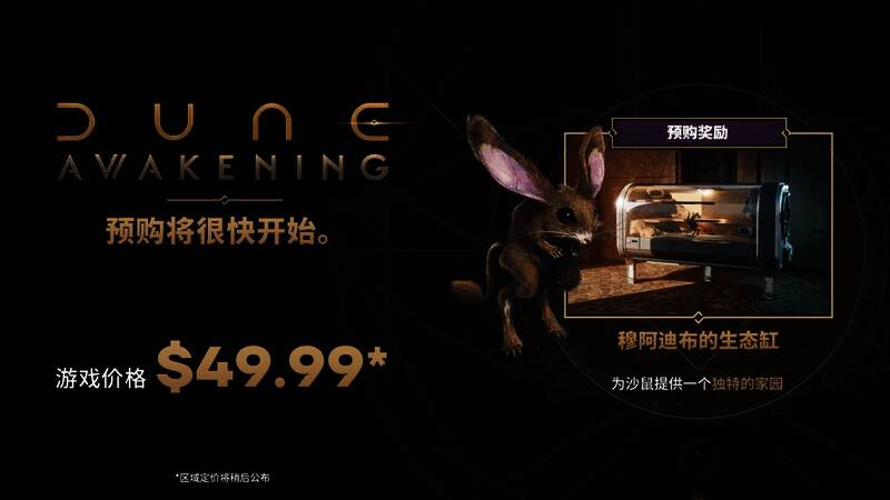 基础游戏定价为$49.99/€49.99,预购将很快开始。预购《Dune: Awakening》的玩家还将获得穆阿迪布的生态缸,这是一个精美的基地装饰,里面住着我们最喜欢的沙鼠,它在日常生活中很是忙碌。穆阿迪布或许对沙漠之道充满智慧,但对于生态缸也同样有所了解。
