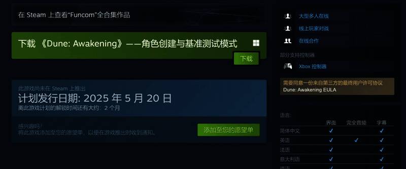 Funcom宣布生存网游《沙丘:觉醒》将于5月20日发售,登陆PC Steam,自带简体中文。基础版游戏售价50美元/50欧元,预购即将开启。此前,Funcom提到《沙丘:觉醒》将于晚些时候登陆主机平台。