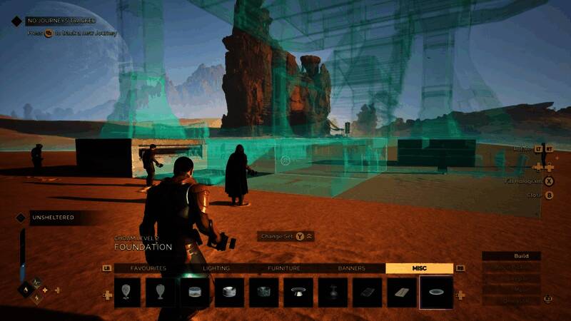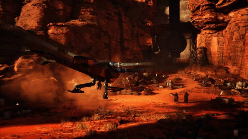 启动基准测试序列,测试你的PC性能并调整显卡设置,以找到最适合你的平衡点。飞行序列将带你从一处玩家建造的沙漠基地飞到哈克村——那个阴沉而繁忙的哈克南玩家中心,最后以与一只巨大的沙虫近距离接触作为结尾。