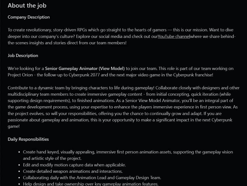 这个职位位于波士顿分部,职责是负责开发《赛博朋克2077》续作《猎户座计划》。职位描述提到,高级游戏动画师要利用专业知识,来增强玩家在第一人称视角下的沉浸式体验。动画师将负责制作“手工调制的、具有视觉吸引力、身临其境的第一人称动画资产”。将《赛博朋克2077》续作打造成CDPR下一部巨作。