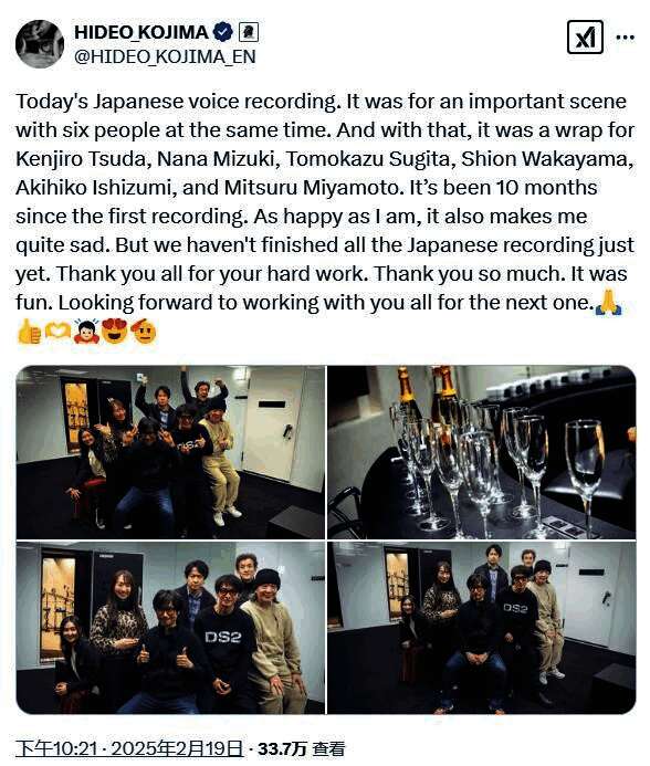 并且小岛秀夫还在推文中表示,以上六个人的配音工作已经完全结束,从首次开始录制到现在已经过去了10个月,但是《死亡搁浅2:冥滩之上》的日语配音还没有完全结束。