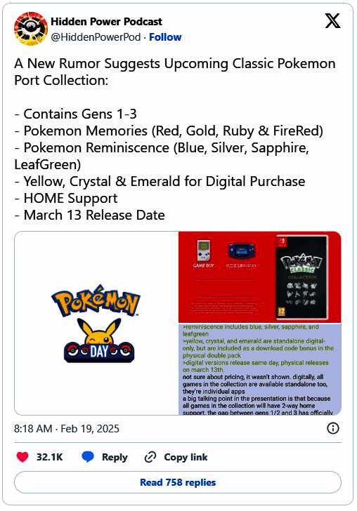 一个名为Hidden Power Podcast的账号在社交媒体上转载了一条来自于4chan论坛的传言,汇总了关于一款经典宝可梦游戏合集的信息。“暗示即将推出经典宝可梦游戏合集。”这个账号之前还报道过关于《宝可梦传说:ZA》的泄露信息,其中包括一种新的伊布进化形态。