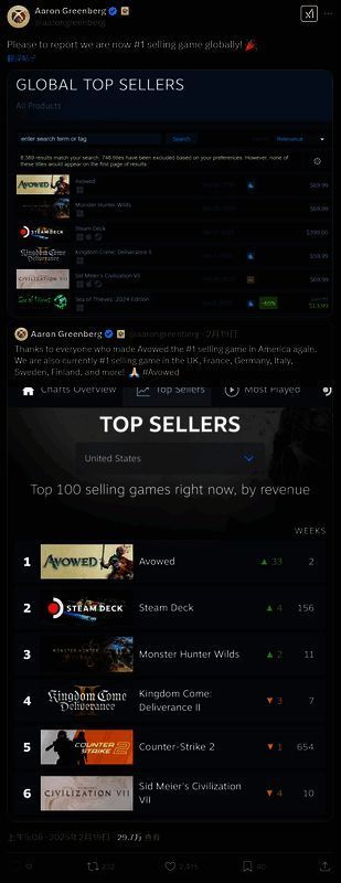 微软游戏营销副总裁 Aaron Greenberg 日前在社交媒体上发帖称,由黑曜石工作室开发的角色扮演动作 FPS 游戏《宣誓》已在美国、英国、法国、德国、意大利、瑞典和芬兰等地登上了 Steam 畅销榜榜首。