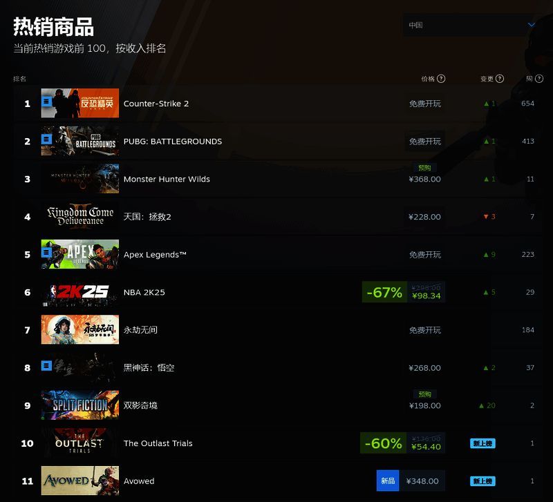 截至稿前,游戏依然在欧美多国位居榜首,不过在全球榜排名第三,落后于《CS2》以及《怪物猎人:荒野》的预购。在国区,游戏排名掉出了前十位,不及最近推出的《天国:拯救2》、《双人成行》开发商新作《双影奇境》以及近日促销的《逃生:试炼》。