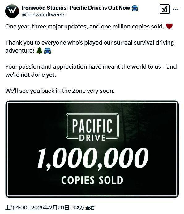 2月20日,开发商Ironwood Studios官方X发文宣布,驾驶生存游戏《超自然车旅》自2024年2月发售以来销量已达到100万份,该作现已登陆PS5和Steam,在发售的一年时间里,游戏总共进行了三次重大更新,并且Ironwood Studios还在新推文中承诺,游戏开发仍未结束,后续还会有更多内容推出。