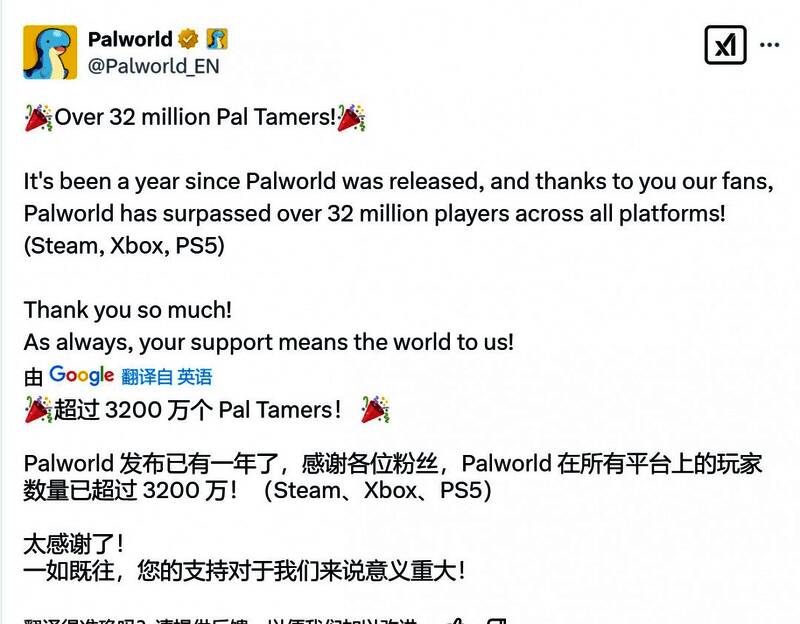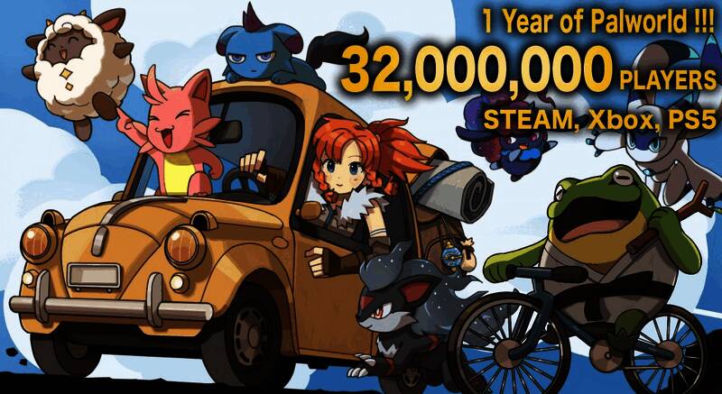 Pocketpair在X上表示:“自《幻兽帕鲁》发售以来,已经过去了一年,感谢我们的粉丝,这款游戏在全平台(Steam、Xbox、PS5)超过了3200万玩家。”