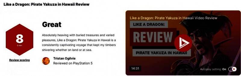 《如龙8外传:夏威夷海盗》将于2月20日发售。近日该作的媒体口碑解禁,外媒IGN为其打出8分好评。IGN认为《如龙8外传》的海盗冒险旅程让人着迷!