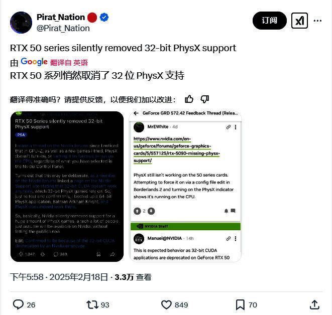 英伟达称CUDA驱动程序将继续支持在GeForce RTX 40、GeForce RTX 30系列、GeForce RTX 20/GTX 16系列、GeForce GTX 10系列和GeForce GTX 9系列GPU上运行32位应用程序二进制文件。但在GeForce RTX 50系列和更新的架构上则不支持。