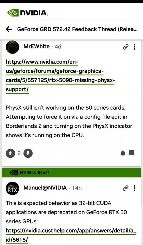 据外媒报道,英伟达在50系列显卡中移除了对所有32位游戏的GPU PhysX支持,这意味着RTX 5090和RTX 5080(以及所有其他RTX 50系列GPU)将无法通过GPU加速PhysX来运行《雪域危机:沉睡之谜》、《蝙蝠侠:阿卡姆之城》、《无主之地2》、《幽灵行动:尖峰战士2》、《镜之边缘》、《刺客信条4:黑旗》和《生化奇兵:无限》等游戏。相反,你将不得不依赖CPU PhysX解决方案,这与AMD GPU多年来一直提供的方案类似。