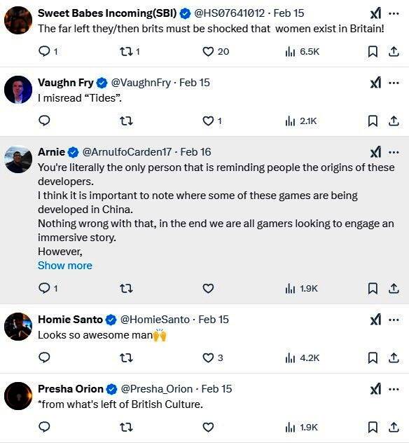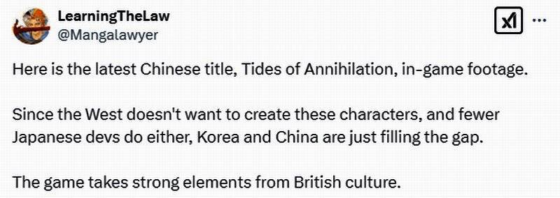该博主表示:“这是中国游戏《湮灭之潮》游戏画面。由于西方不想创造这类角色,日本开发者也很少这么做,因此中国和韩国正好填补了这一空白。这款游戏吸收了浓重的英国文化元素。”