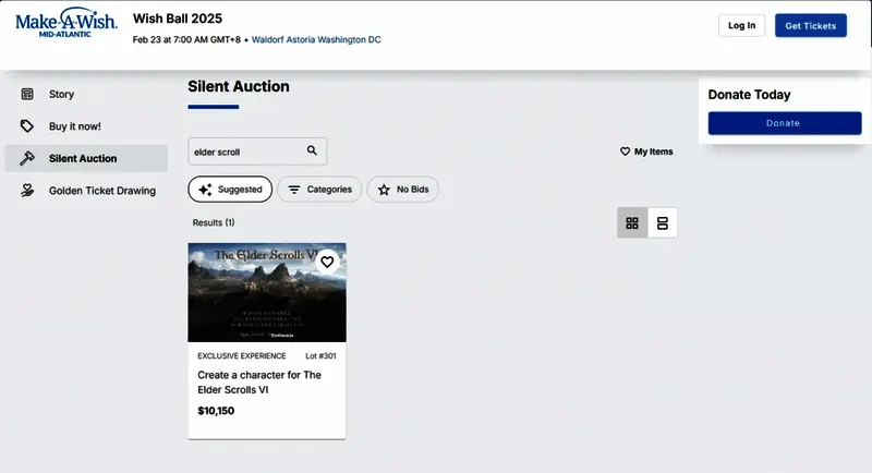 拍卖会描述道:“召集所有玩家和幻想爱好者!这个百年难遇的机会让你在有史以来最引人期待的电子游戏中永垂不朽,《上古卷轴6》中将出现你的定制角色,让你和《上古卷轴》系列一起载入史册,通过这个独家体验,你将与开发者合作,创建一个定制角色,该角色将出现在游戏中。”