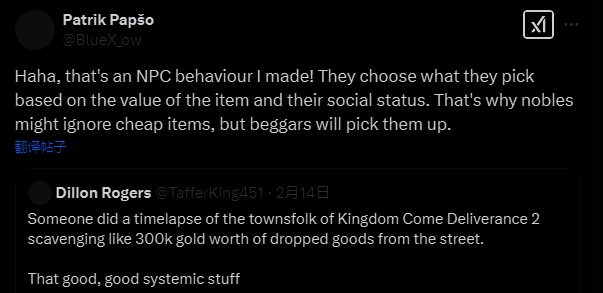 ·《天国:拯救2》的开发者也注意到了这个有趣的测试,回应游戏的确有“阶级性”的设定,丰衣足食的贵族们自然不会放下架子去捡。