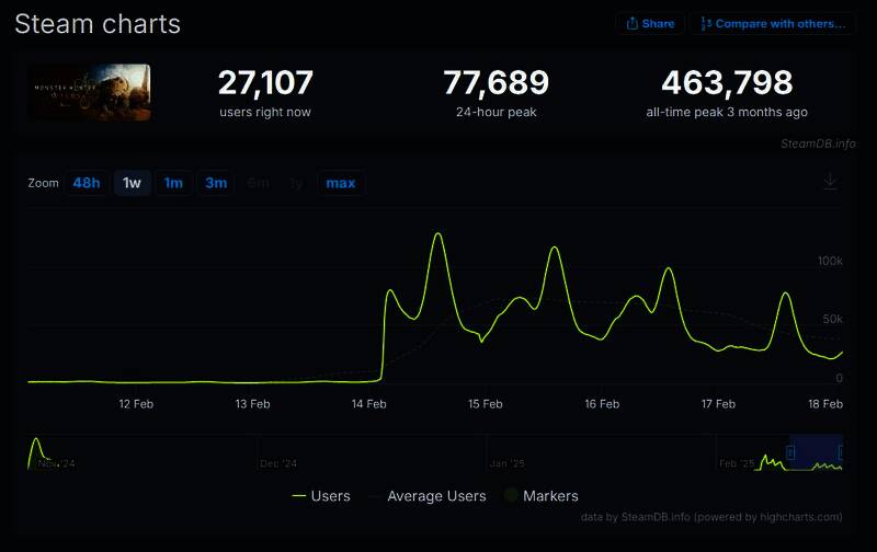 而这可能也是卡普空为《怪物猎人:荒野》推出PC版专用的硬件性能测试工具的原因。此外从SteamDB上可以看出这款游戏在PC平台上的庞大受众群体:《怪物猎人:荒野》测试版同时在线玩家人数峰值达到463798人,远超出已发售的《怪物猎人:世界》(在线峰值为334684人)和《怪物猎人:崛起》(在线峰值为231360人),以及比一些热门游戏如《绝地潜兵2》、《在我们之中》等在线峰值还要高。