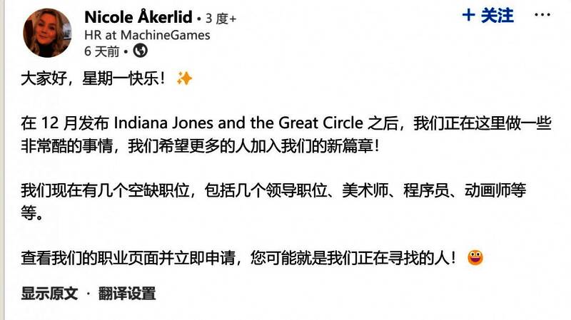 MachineGames开发者Nicole Akerlid在领英上发帖确认,该工作室正在开发多个游戏。该公司有几个空缺职位,如美术、程序员、动画师等,这表明距离发售还很远。