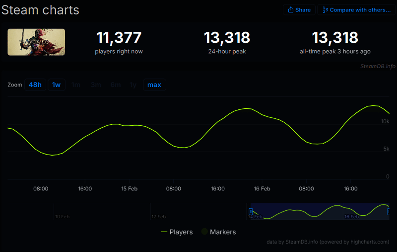 据Steamdb数据显示,目前《宣誓》在Steam上玩家峰值达到13318人,这只是抢先体验阶段的峰值人数。游戏正式发售后,其峰值还会大幅提升。