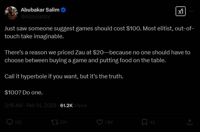 Abubakar Salim表示,任何人都不应该在购买游戏和食物之间做出选择。这也是他将自己工作室开发的游戏《Tales of Kenzera:Zau》定价为20美元的原因。