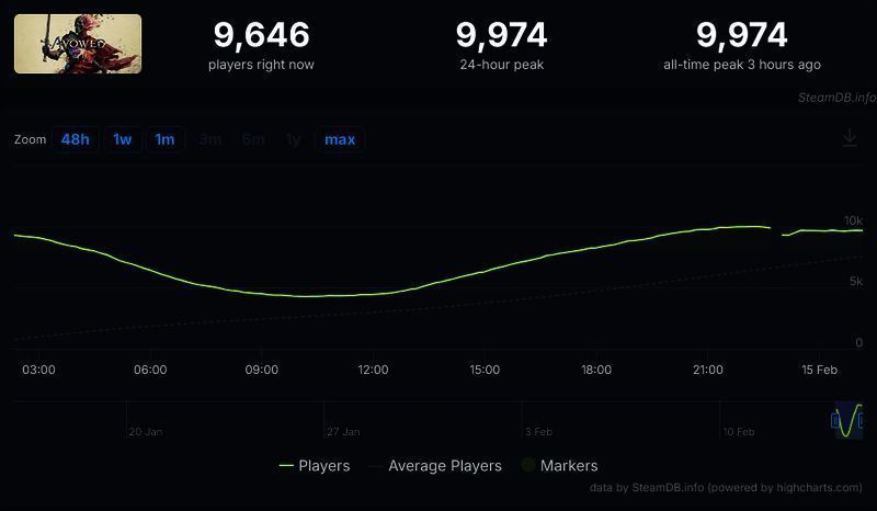 另一方面,游戏目前已经面向高级版预购玩家开启了抢先体验。根据 SteamDB 显示,在此期间的同时在线玩家超过 9 千人,最高接近 1 万人(9974)。该数字不包括 Xbox 应用 PC 用户。在游戏发售时,玩家人数应该还会更多。