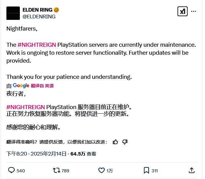 《艾尔登法环:黑夜君临》在昨晚7点开启了第一轮封闭网络测试,但由于成千上万的玩家涌入服务器尝鲜这款《艾尔登法环》多人衍生作,导致《艾尔登法环》官推发布公告,宣布该作的PlayStation服务器不得不进入维护状态。