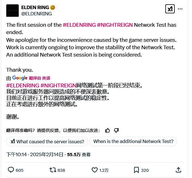 万代官方也意识到这个问题,一方面《艾尔登法环》官推向玩家道歉,称正努力改善网络测试的稳定性,同时又表示正在考虑举行额外的测试环节,以补偿玩家。