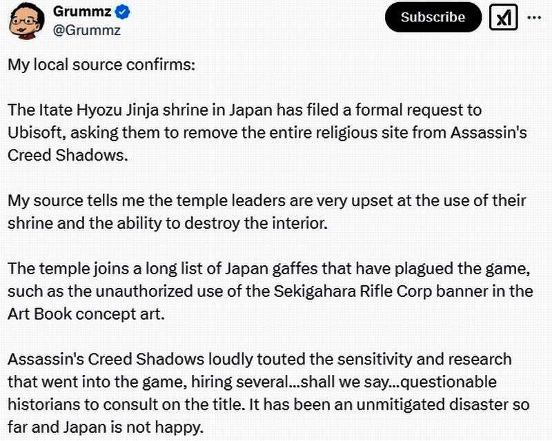 Grummz表示:“据知情人士透露,日本神社负责人对游戏擅自使用其宗教建筑、并允许玩家破坏内部场景的行为非常不满。此举使神社成为继‘关原铁炮队旗帜遭艺术设定集盗用事件’后,《刺客信条:影》涉及日本文化争议的最新案例。”