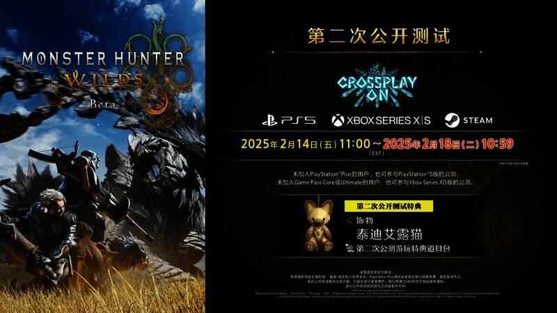 《怪物猎人:荒野》第二次BETA公测(OBT2)第二轮测试将在今天上午11点正式开启,Capcom为补偿之前因PSN宕机而无法参与的PS5玩家,将结束时间比之前延长了24小时。原计划是2月17日11点结束,但现在改为了2月18日11点。