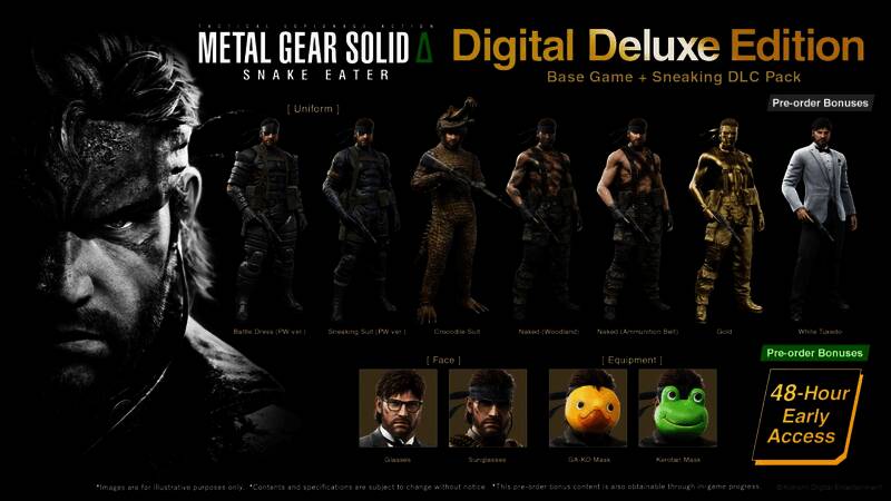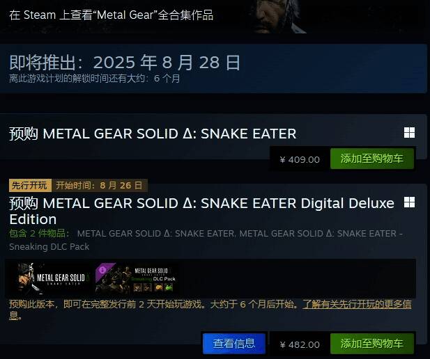 《合金装备3:重制版》将于8月28日发售。现在Steam预购已开启,国区标准版售价409元,豪华版售价482元。豪华版玩家可提前两天游玩本作!