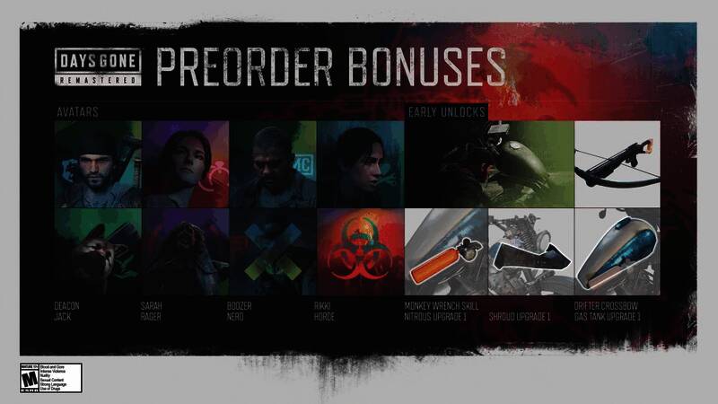 预购《往日不再 Remastered》的玩家可获得八款 PSN 头像,包括 Deacon、Jack、Sarah、Rager、Boozer、Nero、Rikki 和 Horde,并可提前解锁五项游戏内升级内容,如「猴子扳手」技能、「氮气升级 1」、「防护罩升级 1」、「漂泊者弩」与「油箱升级 1」。