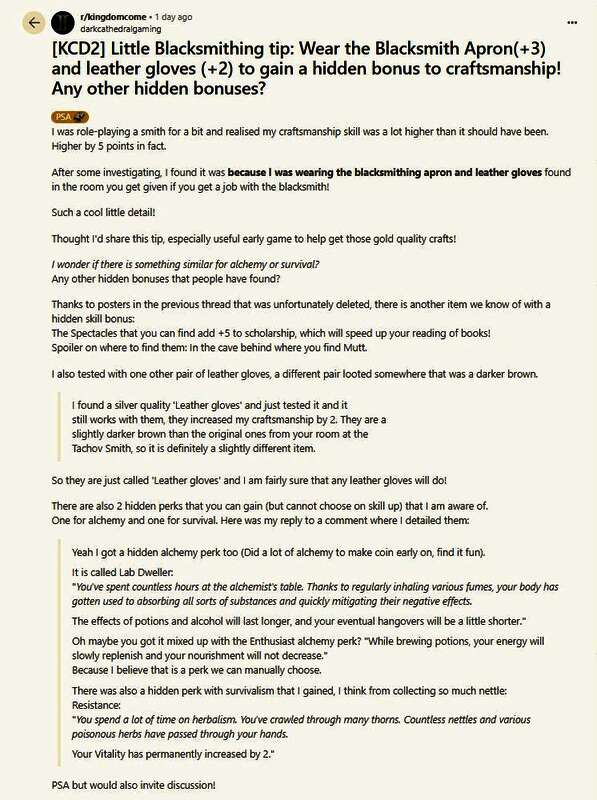 在“darkcathedralgaming”发布的帖子里可以看到,该玩家发现在将角色扮演成铁匠的过程中,其铁匠技能的效果比正常效果多出了5点,而这是穿著了铁匠围裙和皮手套后带来的增益(随后验证任何名为皮手套的装备都可以提供加2的增益效果)。